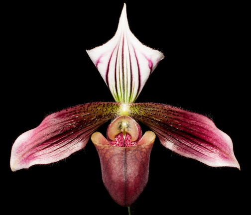 pouch white heavily suffused dark rose, staminode yellow; substance